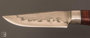 Un couteau fixe semi intégral de Grégory Picard, avec une superbe ligne de trempe et un manche en rondelles de cuir.