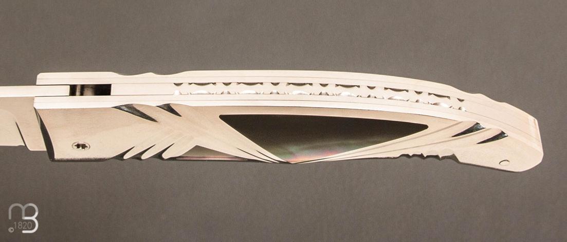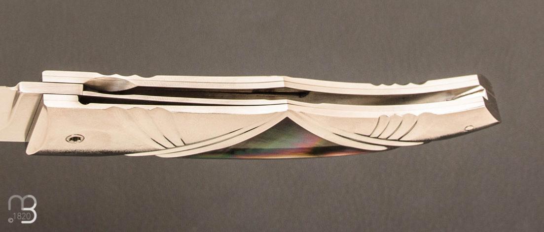 Manche en acier inoxydable 316 L entièrement martelé et sculpté avec interframes en nacre noire de Polynésie.