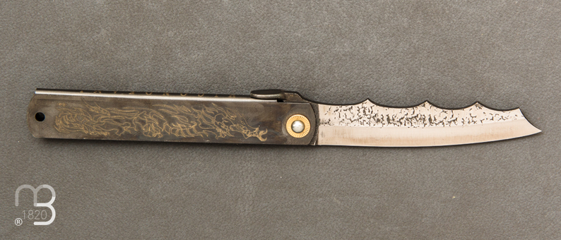 Un couteau higonokami avec une lame aux allures de peau de dragon, et avec l'animal mythique gravé sur le manche.