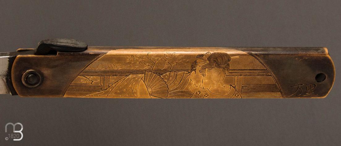 Couteau japonais Higonokami Motosuke Nagao gravé par Mali Irie.