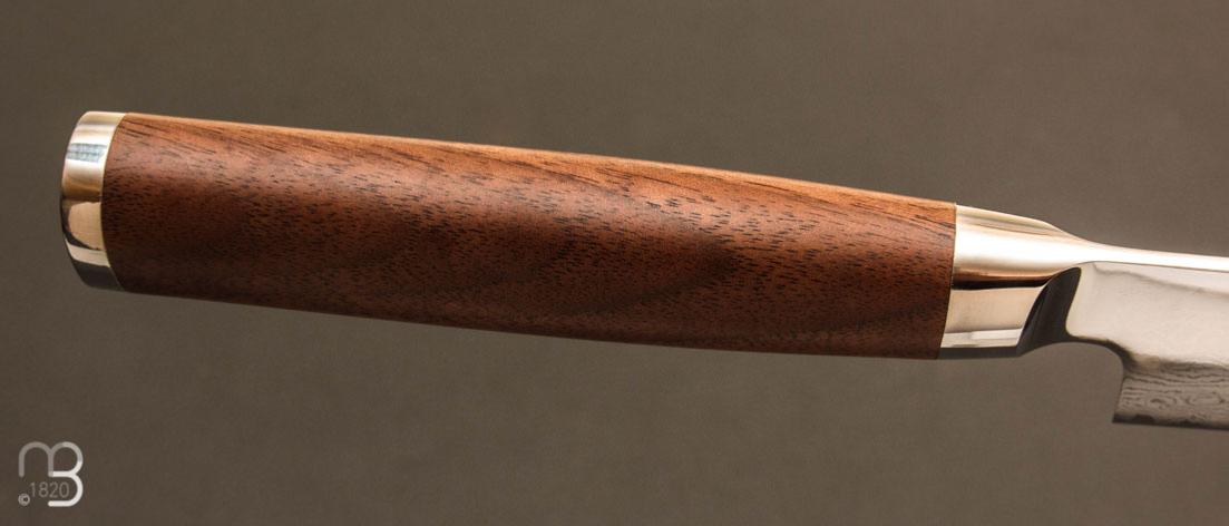 Découvrez ICI ce modèle de la fabrique Ryusen, fabriqué artisanalement au Japon dans la province de Echizen, manche ergonomique en noyer, la lame est forgée en acier VG10 version damassée 66 couches.