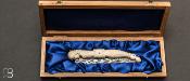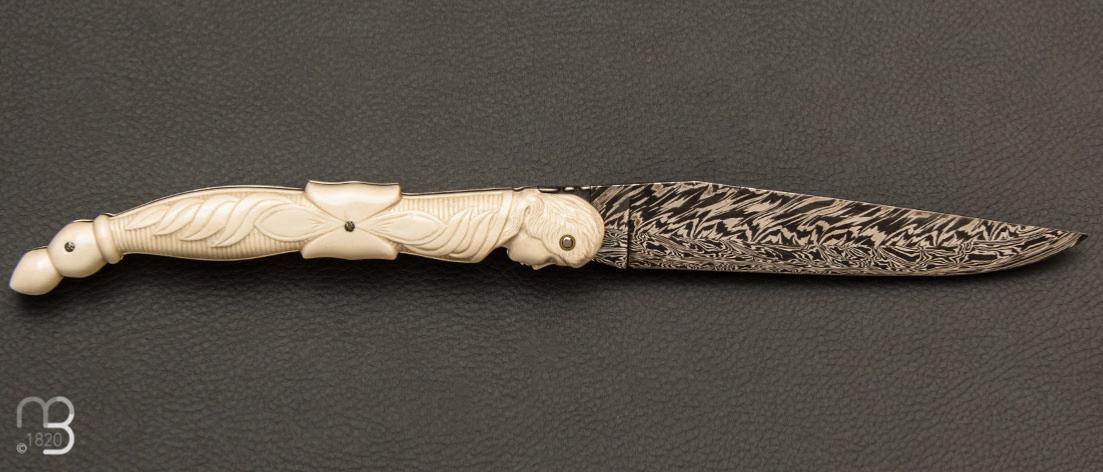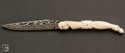 Ce couteau de collection Laguiole sculpté par Philippe Voissière n'est qu'un exemple de plus de la qualité du travail de ce coutelier. Tout dans ce couteau évoque le raffinement: l'ivoire de mammouth, les ornements, les finitions, la souplesse du cran. Une pièce somptueuse, le tout sublimé par une lame en damas de Jean Pierre Veysseyre