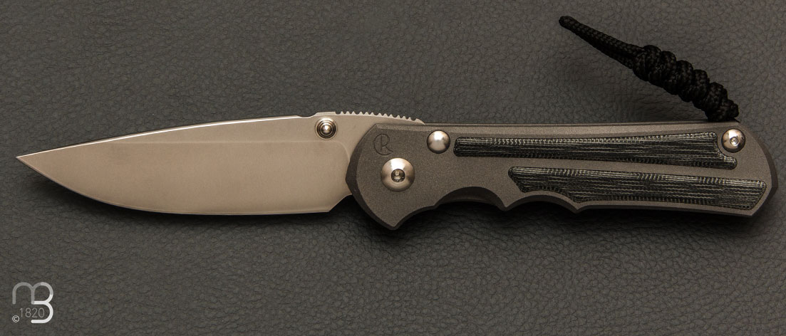 Manche en titane avec insert en micarta canvas, agrafe en titane.