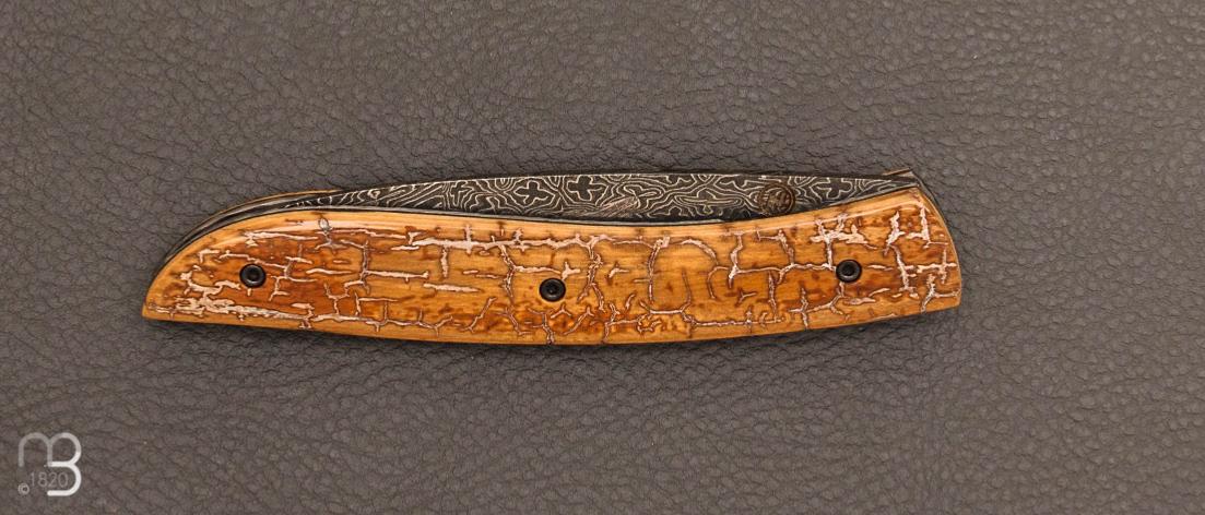 Le Névé est le modèle phare du jeune coutelier Français Tim Bernard, ici proposé en version "luxe" avec des plaquettes en ivoire de mammouth et une lame en damas mosaïque forgé par Tim.