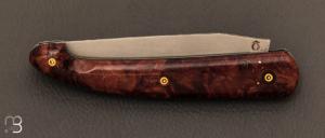 Le couteau "Le passager" de Pierre Thomas est un couteau pliant à cran forcé, ici proposé en version "prestige" le manche est composé de plaquettes en loupe de chêne stabilisée.
