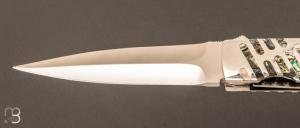 Lame style dague en acier inoxydable Cowry-Y (62HRC) finition poli miroir avec bouton d'ouverture en nacre.