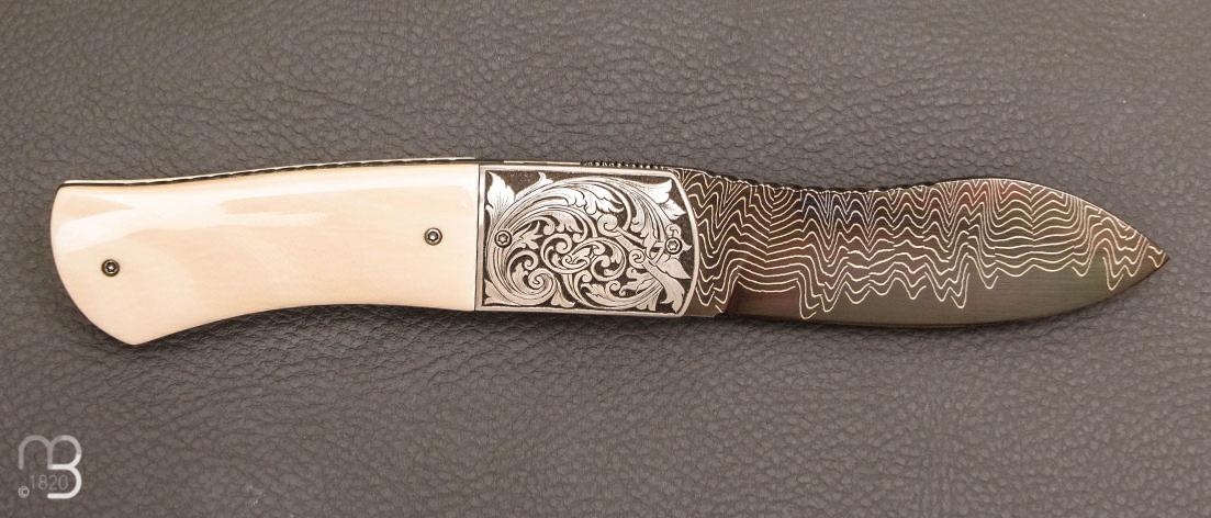 Manche composé de plaquettes en ivoire de mammouth et mitres en acier inoxydable gravées au burin par l'artisan.