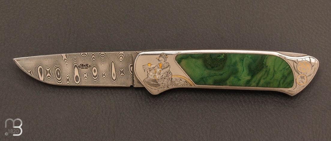 Couteau " Lock-back " interframe folder Jade et damas par Aad Van Ryswyk