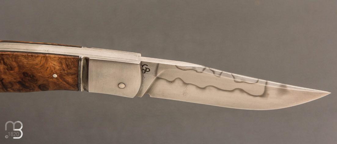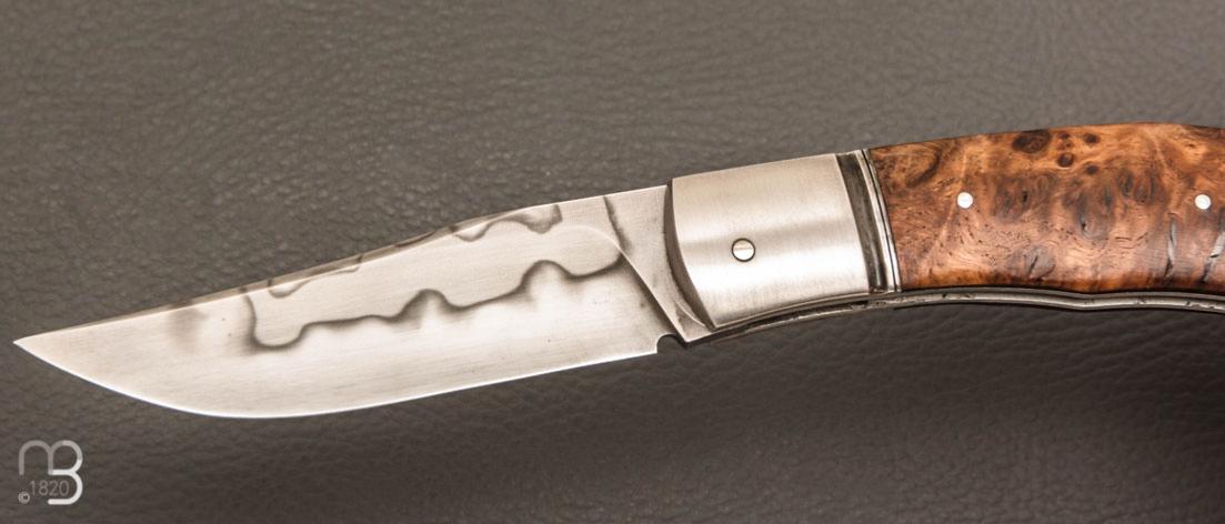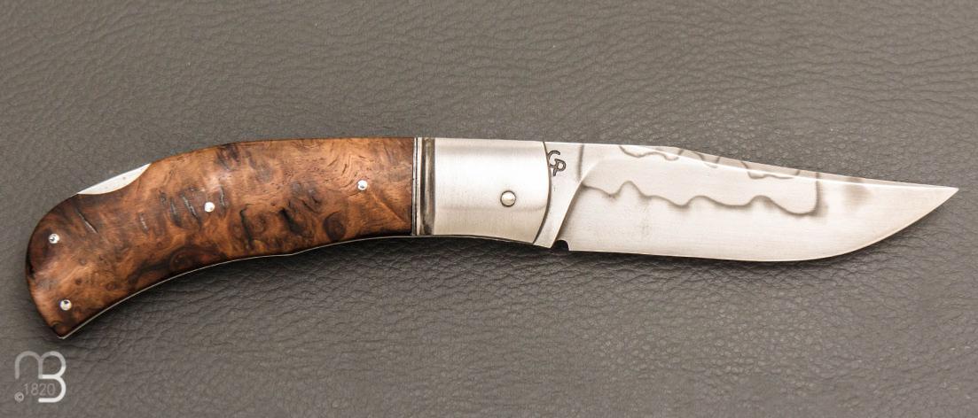 Un couteau pliant de Grégory Picard, avec un manche en ronce noyer et une lame en acier C105 avec ligne de trempe sélective