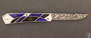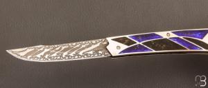 Couteau  "  Lock-Back " pliant damas poétique / émail sur argent pur par Pierre REVERDY