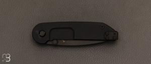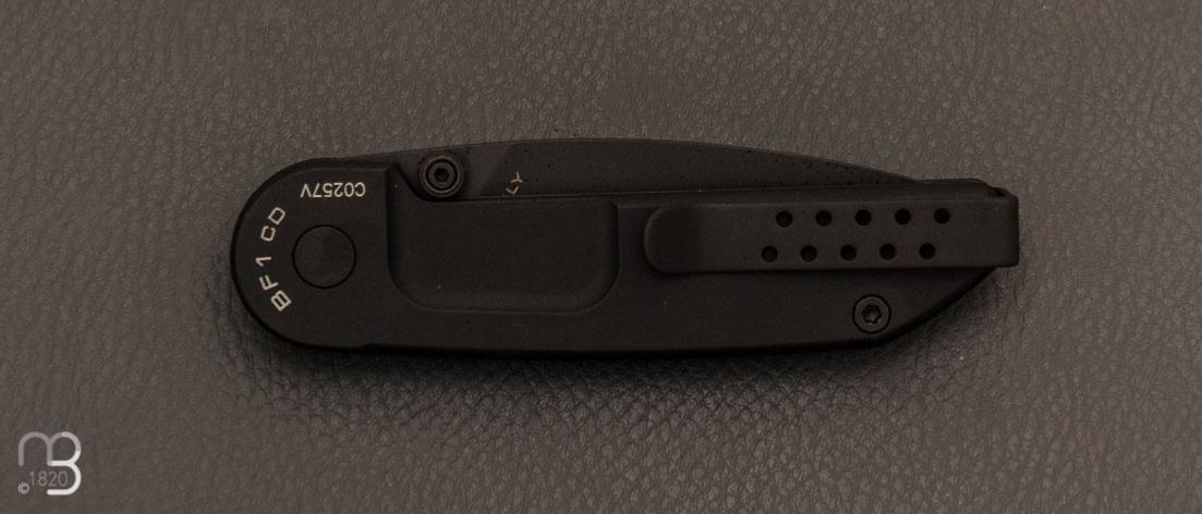 Couteau militaire BF1 de poche pliant, tout usage, poids 85 g, longueur lame 70 mm en acier N690 (58HRC) brunissage noir satiné par application d'un traitement au carbonitrure de zirconium, longueur ouvert 170 mm, blocage lame liner lock, clip ceinture démontable et positionnable sur autre côté du manche