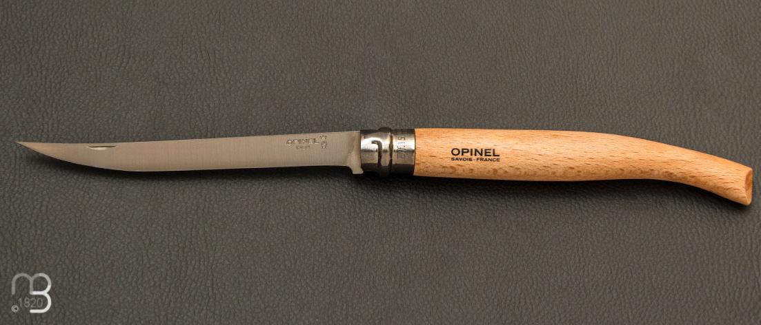 Couteau Opinel lame effilée avec onglet en acier inoxydable Sandvik longueur 150 mm, manche en hêtre longueur 170 mm, double système blocage lame ouvert/fermé par virole.