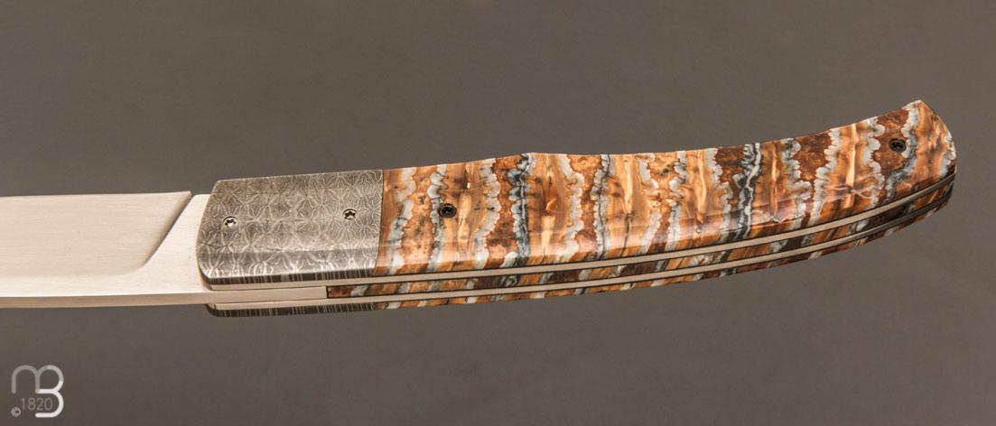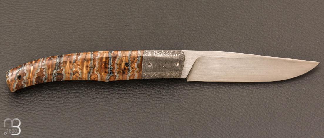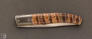 Le P45 est un couteau de poche s'inscrivant dans le terroir Drômois, il est néanmoins interprété par notre ami bourguignon, avec des plaquettes en molaire de mammouth stabilisée et des mitres en damas splendide.