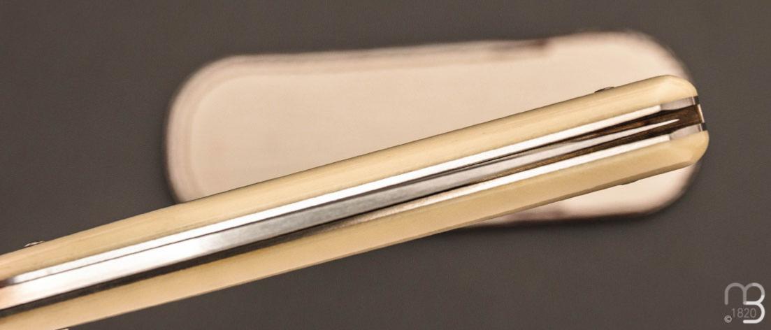 Plaquettes en micarta ivoire, mitre en acier inoxydable.