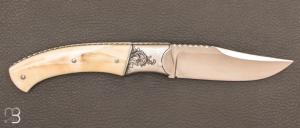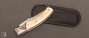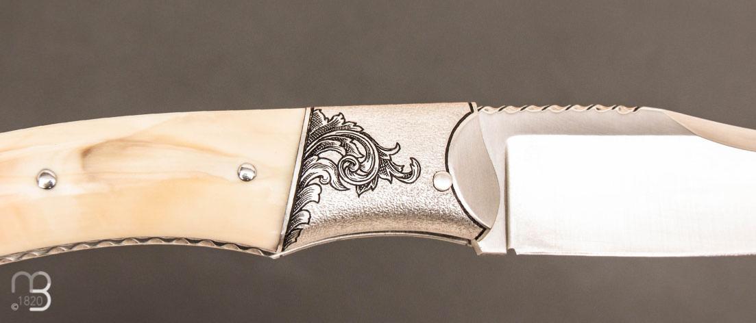 Couteau cran forcé en ivoire de phacochère et mitres gravées