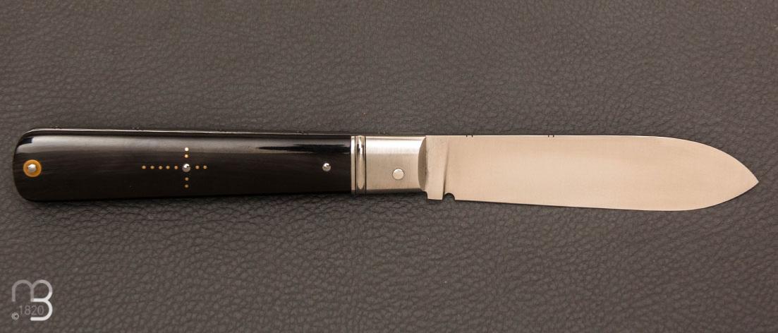 Manche composé de plaquettes en corne de zébu avec joli travail de cloutage en laiton, mitres en acier inoxydable.