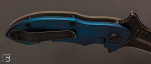 Manche en titane anodisé bleu d'un côté et titane sablé avec motif " écailles de poisson " de l'autre.