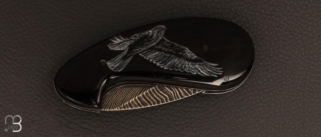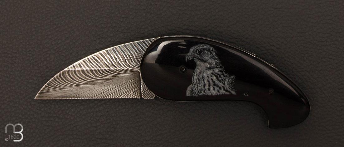 Couteau " Scène de Faucon " lock-back par Eric Depeyre - Damas et corne de buffle