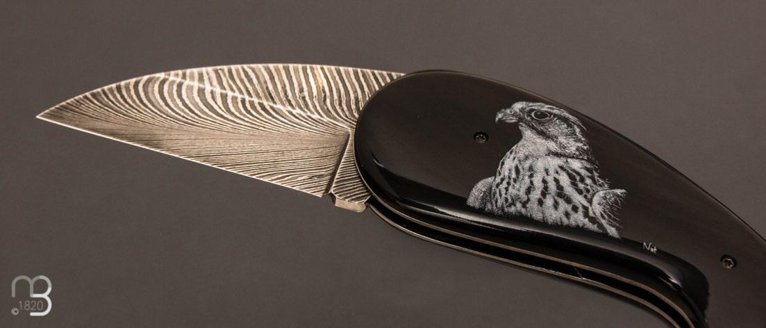 Couteau "  Scène de Faucon  " lock-back par Eric Depeyre - Damas et corne de buffle