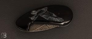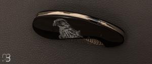 Plaquettes en corne de buffle du Vietnam, avec de part et d'autre des scène de faucons réalisé en scrimshaw négatif par l’artiste Nathalie Favede.