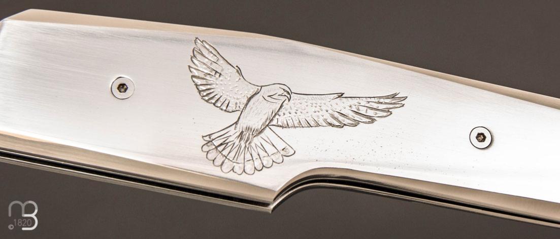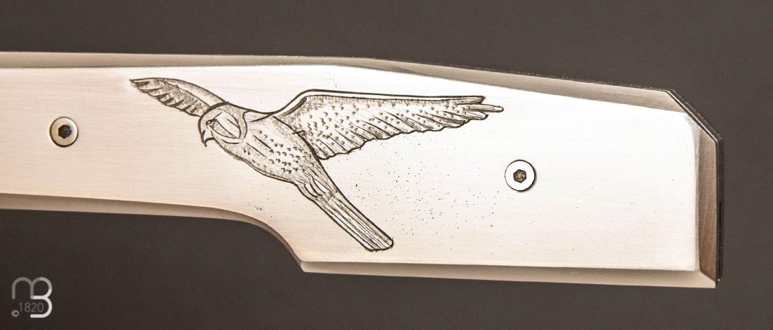 Manche en acier inoxydable 416 avec gravure "scène de faucon" par Xavier Bondel