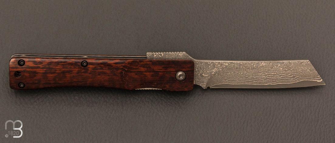 Un couteau de poche japonais sobre pourvu d'un beau manche en amourette et d'une lame en damas efficace.