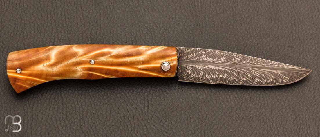 Couteau d'exception réalisé par le coutelier Ardéchois Anthony Brochier, lame en damas plume forgée main et plaquettes en fourche de peuplier stabilisé, ajustage et mécanique parfaite !