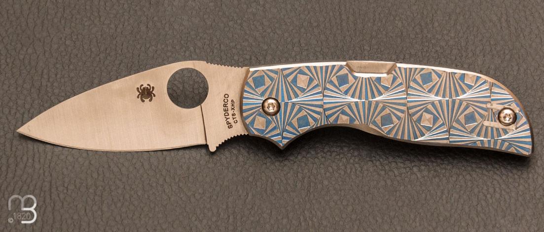 Couteau pliant Spyderco américain avec un manche en titane anodisé bleu et entièrement usiné.