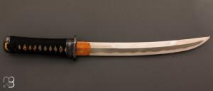 Ce couteau vous sera livré avec un saya réalisé sur mesure pour le tanto, réalisé en bois de jacquier non siliceux, kurigata en corne de buffle, Shito Domes en laiton guilloché.